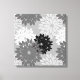 Wandte Leinwand in einem modernen Nehmen an einem traditionellen japanischen floralen Kimono-Druck - stilisierte Blume in Grafittönen und hellgrau / grau, schwarz und weiß auf mittlerem grauen Hintergrund