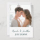 Moderne Foto Floral Wedding Save the Date Eine stilvolle minimalistische Hochzeit Sichern Sie das Datum mit elegantem schwarzen Drehbuch auf einem schlichten, weißen Hintergrund mit einer Blume auf einer Seite. Personalisieren Sie Ihre Veranstaltungsdetails.