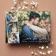Chic Hochzeit speichern Sie das Datum flache Karte, die Ihre Verlobung Foto überlagert mit einem Streifen von drei kleineren quadratischen Fotos und "Save the Date" in einem stilvollen weißen Skript. Fügen Sie Ihre Vornamen und Hochzeitstag in einfachen modernen weißen Typografie. Auf der Rückseite personalisieren Sie Ihre Save the Date Details in eleganter Typografie