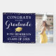 Ein modernes Banner "Glückwunsch zu unserem Absolvent" mit marineblau-Hintergrund, der in jede beliebige Farbe geändert werden kann, ein Foto des Abschlusses, Imitate goldene Glitzer Dekoration, ein Imitat Goldabschlusskappe und Text, der leicht angepasst werden kann.