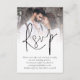 Moderne Foto Overlay QR Code Hochzeit RSVP Karte. Laden Sie Ihre Gäste ein, online zu antworten. Fügen Sie Ihren QR-Code auf der Antwortseite Ihrer Hochzeitswebsite auf der Rückseite ein. Eine informelle Set-Typografie in schwarz für die Hauptüberschrift UAWG und die Erholung des Textes, die leicht personalisiert werden kann. Ersetzen Sie das Beispiel-Foto durch Ihren eigenen Favoriten der Landschaftsorientierung.