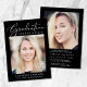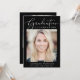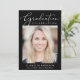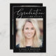 Elegante Girl's Black Abschluss Ankündigung und Party Einladung grad mit "Abschluss Celebration" in modernen weißen Drehbuch und Typografie, ihr Foto und ihren Namen, Schule und Klasse Jahr in schlicht weiß Typografie. Auf der Rückseite, fügen Sie ein weiteres Foto und die Graduierung Party Details.