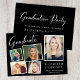 Moderne Black Graduation Party Einladung, die eine 5-Foto-Collage verstreuter Bilder in weißen Rahmen, "Graduate" in einem zeitgenössischen weißen Drehbuch, den Namen des Grads in eleganter weißer Typografie und ihre Schule und Klasse Jahr in schlicht weißer Typografie. Personalisieren Sie Ihre Party-Details auf der Rückseite.
