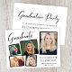 Moderne Graduiertenfeier mit einer 5-Foto-Collage verstreuter Bilder, "Graduate" in einer zeitgenössischen Schrift, der Name des Grads in eleganter Typografie und ihre Schule und Klasse Jahr in einfacher Typografie. Personalisieren Sie Ihre Party-Details auf der Rückseite.