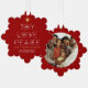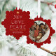 Moderne Typografie "Joy, Liebe, Peace" Eine Foto-Ornament-Karte. Roter Hintergrund.