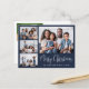 Moderne blaue Urlaubspostkarte mit einer 4-Foto-Collage auf der Vorderseite, "Frohe Weihnachten" in einem stilvollen weißen Drehbuch und Ihr Name und Jahr in schlichter weißer Typografie. Auf der Rückseite fügen Sie ein zusätzliches Foto und eine personalisierte saisonale Botschaft an Familie und Freunde.