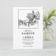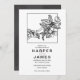 Elegante und moderne Blumen-Hochzeitseinladung mit einem handgezeichneten Kirschblütenzweig in einem dekorativen Rahmen. Schwarz-Weiß-Farbschema Geeignet für Frühjahrshochzeiten.