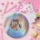 Moderne Kreation mit holografischen Farben und runden Formen, die mit Ihrem Foto und Text personalisiert werden können. Bitte beachten Sie, dass für den Druck dieses Produktes normale Tinten verwendet werden und das metallische Glanz im Design simuliert wird.