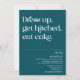 Dress auf, komm runter, iss Kuchen. Modernes, lustiges minimales Design auf aquamarinem Hintergrund mit trendiger Typografie. Der Text kann leicht für ein einzigartiges Design für Ihren besonderen Tag personalisiert werden.