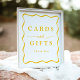 Fügen Sie Ihrer Hochzeit, Ihrem Brautparty, Ihrer Babydusche, Ihrer Abschlussfeier oder einem anderen besonderen Event eine stilvolle Touch mit diesem Modern Yellow Wavy Frame Kartenzeichen und dem Geschenkzeichen hinzu. Das Design zeigt "Karten und Geschenke" in fett gelben Schriftzeichen, umgeben von einem gelben, gewellten Rand kontrastiert mit einem weißen Hintergrund. Personalisieren Sie die Retro-Karten und Geschenke-Zeichen mit Ihrem benutzerdefinierten Text unten. Wählen Sie zwischen beruflichem Druck oder Sofortdownloads, um Flexibilität zu bieten.