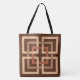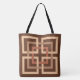 Gedruckte Tüte in einem Retro-Muster mit modernen ineinander greifenden Quadraten in Bräune, heller Moscha und Rostbraun auf dunkelschokoladenbraunem Hintergrund