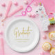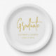 Moderne Trendy Gold Script Graduation Party, kundenspezifisches Whitepaper Platte ein Elegant Minimalistisch Design Celebrate Ihrem Absolventen im Stil mit diesem modernen trendigen Drehbuch-Teller mit einem stilvollen, knallweißen Hintergrund und eleganten, stilvollen schwarzen Drehbuch. Das minimalistische Design eignet sich perfekt für eine stilvolle und zeitgenössische Abschluss-Feier. Personalisieren Sie ganz einfach mit unseren Vorlagen, fügen Sie den Namen Ihres Absolventen, die High School oder Uni, und das Unterrichtsjahr in Sekunden. Ideal für Abschlussfeiern, offene Häuser und unvergessliche Events. Dieses exklusive Design, das von der Künstlerin Catherine Sweetman entworfen wurde, bringt moderne Eleganz in Ihre Tischdekoration. Ideal für diejenigen, die eine saubere, elegante Ästhetik mit persönlicher Touch suchen.