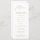 Entspannen Sie bei einem Hochzeitsempfang mit unserem wunderschön gestalteten Hochzeitsmenü, das mit einem handgeschriebenen goldenen Drehbuch auf weißem Hintergrund besticht. Dieses moderne Design ist perfekt für Paare, die ein schlichtes und dennoch raffiniertes Aussehen suchen. Es lasse Ihnen, sich mit Ihren Namen, Ihrem Hochzeitstag und dem Menü-Angebot persönlich zu fühlen. Sein minimalistischer Stil ergänzt mühelos jedes Hochzeitsthema und sorgt für eine Touch Eleganz. Lassen Sie sich von einem Menü beeindrucken, das die schicke Einfachheit Ihrer Hochzeitsvision widerspiegelt.