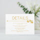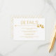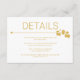 Diese Details-Einschließkarte ist eine elegante Wahl für jede Hochzeit, mit einer goldenen Linie mit einem Zweig und Blätter auf der einen Seite und einem Single Punkt auf der anderen, Set auf einem weißen Hintergrund. Auf der Rückseite befindet sich ein diagonales Muster, das die Namen des Paares in Gold abbildet und eine anmutige Touch verleiht. Wenn die Namen mehr oder weniger Platz beanspruchen, passen Sie einfach die Größe des Schriftartes entsprechend an.