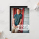 Ein einfaches und modernes Design, das das Foto Ihres Absolventen auf der Vorderseite mit allen Party- oder Ankündigungsdetails auf der Rückseite zeigt. Modernes, zeitgenössisches Typografie-Design mit maskulinem Ambiente. Cutout Banner Ihr Foto zum flüchtige Blick durch fügt einen modernen Vorsprung. Eine lässige und dennoch raffinierte Ankündigung, die Ihren Sohn und seinen Abschluss feiert.