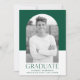 Einfache und stilvolle Graduiertenparty mit dem Foto des Absolventen in einem Bogen-Rahmen mit einem grün-weißen Blockhintergrund. "Graduate" wird in grün-moderner Schrift mit dem Namen, der Schule und dem Abschluss des Absolventen angezeigt, wie unten gezeigt. Auf der Rückseite der grünen Graduierungsparty-Einladung finden Sie Details zu Ihrer Graduiertenparty.