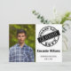 Dieses einfache und saubere Design weist einen schwarzen Kreis auf, wie eine Briefmarke mit schwarzer Typografie, die "class of" und den Abschluss Jahr auf einem weißen Hintergrund. Fügen Sie das Foto, den Namen und das Jahr des Abschlusses des Absolventen hinzu und füllen Sie alle Party-Informationen auf der Kartenrückseite aus. Ideal für eine Party Einladung in der Oberstufe oder im Uni-Abschluss. Andere Hintergrundfarben sind auch in unserem Shop erhältlich.