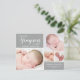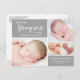 Eine moderne Geburtsankündigung Postkarte, um die Nachricht von der Ankunft Ihres Babys zu teilen. Die graue Vorderseite weist eine 4-Foto-Collage mit Babynamen in einem modernen, weißen Skript auf. Alle anderen Schlüsseldetails wie Geburtstag, Geburtsdaten, Eltern-Namen sind in einer einfachen weißen Typografie. Auf der Rückseite befinden sich Ihre Rücksendeadresse und Speicherplatz für eine persönliche Nachricht oder löschen Sie Text, um für eine handschriftliche Notiz leer verlassen.