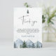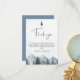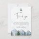 Winterliche, wildnis-themen-bezogene Baby-Party-Dankeskarte mit Bergen und Kiefern sowie schwach gefärbten Schneeflocken. Diese 'Baby, es ist kalt, Baby'- oder Winter- bzw. Wildnis-Baby-Party-Dankeskarte ist ideal für eine Winter-Baby-Party.