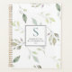 Behalt mit diesem ausgeklügelten Planer über deine Termine und Aufgaben hinaus. Dieses Design zeichnet sich durch ein lockeres Muster von Aquarellgrün-Blätter auf einem knusprigen, weißen Hintergrund aus, überlagert mit einem weißen, grauen Rechteck mit Ihrem Inital/Monogramm, Name und Jahr in grau und aquamarin. Auf der Rückseite des Planers befindet sich auch das Muster der Blätter auf weißem Hintergrund.