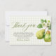 Sagen Sie danke in süßem, zeitlosem Stil mit dieser modernen grünen Gingham- Dankeskarte "Perfect Pair" zur Hochzeitsfeier. Mit einem sanften grünen Gingham-Hintergrund, zarten Wasserfarbenbirnen und eleganter Schreibschrift-Typografie wirkt dieses Design frisch, romantisch und mühelos charmant.