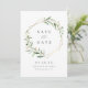 Moderne Green-Save the Date-Karte mit rustikalem botanischen Blattgrün und Imitaten goldenen Folie Blätter und geometrischen Rahmen, einfach und elegant, ideal für grün und goldfarben Sommer rustikale Hochzeit, Frühjahr botanischen Garten Hochzeit. Alle passenden Teile in der Sammlung anzeigen