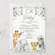 Moderne Green Greenery Foliage Safari Babydusche Einladung Niedlich geschlechtsneutrale Safari Babydusche mit Eukalyptusblättern, vier niedlichen Safaritieren und einem modernen kalligraphischen Schriftart. Ideal für eine Dschungeltiere mit dem Thema Gender Neutral Baby Dusche.