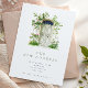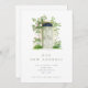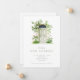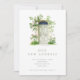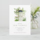 Eine hübsche neue Adresse/neue Zuhause-Ankündigung mit einer Aquarellillustrierung einer grünen Türe, die durch das Klettern von rosa Rosen umgeben ist.