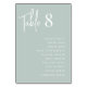 Einfache und schicke Tischnummer-Karten in Sage Green und Weiß machen eine elegante Aussage bei Ihrer Hochzeit oder Veranstaltung. Design-Features "Tabelle [Zahl]" in handgeschriebenen Schriftzeichen, mit einzelnen Gastnamen unten in zeitloser Serifentypografie. Design wiederholt sich auf beiden Seiten.