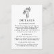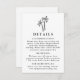 Teilen Sie mit Ihren Gästen unverzichtbare Hochzeitsinformationen mit, indem Sie diese moderne Detailkarte mit einer von Hand gezeichnet schwarzen Palme auf weißem Hintergrund verwenden. Dieses minimalistische Design eignet sich perfekt für tropische, küstennahe oder Hochzeiten in Urlaubsort und bietet Platz für Hotelunterkünfte, Empfang-Details, Ihre Hochzeitswebsite und vieles mehr. Eine elegante und praktische Ergänzung zu Ihrer Hochzeitssuite.