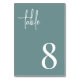 Einfache und schicke Tischnummer-Karten in staubigen aquamarinen und weißen Farbtönen geben bei Ihrer Hochzeit oder Veranstaltung eine elegante Note. Das Design enthält "table" in handgeschriebenen Schriftzeichen, mit der Tischnummer unten rechts in zeitloser Serifentypografie. Design wiederholt sich auf beiden Seiten.