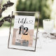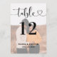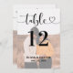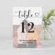 Moderne Schwarz-Weiß-Hochzeitskarten (Farbmodifikation) verfügen über ein Foto des Ehepaares mit einem stilvollen schwarzen Typografie-Design-Overlay, das eine schicke Kalligraphie-Schrift und einen Herzakzent enthält. Der einfache und elegante, benutzerdefinierte Text, der mit der Tischnummer und den Namen der Gäste personalisiert werden kann, die an diesem bestimmten Tisch sitzen. Passen Sie Ihre individuelle Tischnummer (1, 2, 3... usw.) an und fügen Sie sie Ihrem Warenkorb hinzu.