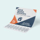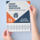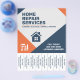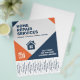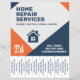 Ein professioneller Flyer für Heimreparaturdienste mit abreißbaren Tabs, mit einem sauberen, modernen Design, das durch kräftige blaue und orangefarbene Akzente sowie ein hausförmiges Symbol geprägt ist, alles auf grauem Hintergrund mit subtilen geometrischen Mustern.
