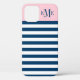 Dress up and protect your iphone with a simple, modern and stylish striped pattern design that is custom mit Monogramm with your first, mittel and last name initials in a preppy serif Schriftart. Dunkelmarineblau und weiße horizontale Streifen kontrastiert mit einem hellrosa Farbblockhintergrund.