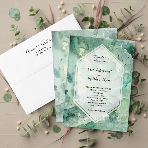 Elegante Aquarellfarben in Grün von der Palastjade bis zum dunklen Smaragd mit Ihren Trauungsdetails in schicken Schriften in einem weißen Einschnitt. Eine moderne und dennoch einfache Wahl für jede Saison Hochzeitseinladungen. PASSENDE Artikel in unserer Sammlung.