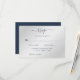 Vervollständigen Sie Ihre Hochzeitsfeier in Blau und Silber mit diesen eleganten RSVP-Karten mit Ihrem Wunschtermin und dem angepassten Akzeptierungs-/Ablehnungsschreiben. Bitte laden Sie die Gäste ein, ihre Vorlieben im Hauptmenü anzugeben und Ihre Speisen nach Ihren Wünschen einzufügen. Matching-Elemente verfügbar. Navy blaue und silberne Hochzeitskarten RSVP.