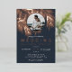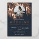 Moderne reale Rose goldene Palmen Aquarell mit einfacher Typografie, ein trendiger und tropischer Hochzeitstil auf Palmenblättern. Fügen Sie Ihr Paar Foto auf bearbeitbaren einfachen minimalistischen dunkelmarineblau Hintergrund.