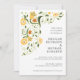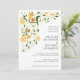 Künstlerische Hochzeitseinladungen mit gelben, orangefarbenen und aquamarinen Blume, Weinreben und Blätter in der links Hand, über einem weißen Hintergrund. Ihre Veranstaltungsdetails sind richtig abgestimmt und rechts neben den Blume und Weinreben. Die Rückseite ist grün und kann in eine beliebige Farbe geändert werden. Dieses Design ist ideal für eine Gartenhochzeit im Sommer.