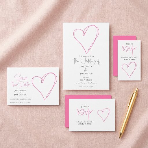 Mit dieser modernen Hochzeitseinladung laden Sie Liebhaber zu einem ganz besonderen Tag ein. Entspannen Sie in einem von der Hand gezeichnet, rosafarbenen Herz und genießen Sie eine spielerische und elegante Touch. Der weiße Hintergrund hebt eine Mischung aus zeitgenössischen Skripten und klassischen Serif-Schriftart hervor, die Ihre Namen und Veranstaltungsdetails mit Klarheit und Stil präsentieren. Die minimalistische Gestaltung und die sanften rosa Akzente schaffen ein romantisches, leicht erreichbares Ambiente, das sich perfekt für moderne, lässige oder intime Hochzeiten eignet.