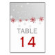 Rot, silbergrau, weißer Schneeflocken, moderne Hochzeitsfeier-Tischnummer Platzkarte, mit Sternen und eleganten roten Schneeflocken auf Grau. Text in rot und grau. Ein stilvolles Design, das perfekt für Ihren Winter, Dezember oder Weihnachten Hochzeit ist. Falten Sie es entlang der gepunkteten Linie, um eine gefaltete Platzkarte im Zeltstil zu haben.