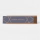 Dieses stilvolle Namensschild mit einem reichen, dunkelblauen Hintergrund und einer vergoldeten geometrischen Konstruktion aus Imitaten in der Rose.