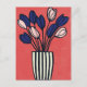 Über einer rosa gestreiften Vase blühen kühne Kobalt-Blütenblätter, die eine spielerische Stimmung aus der Mitte des Jahrhunderts auf einer weichen Korallenbasis wecken.