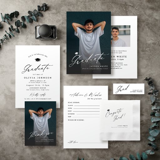 Modernes Kalligraphie-Design in Schwarz und Weiß, mehr Details auf der Rückseite, einfach und einzigartig, großartige personalisierte Graduiertennamenkarten für die Graduiertenparty.