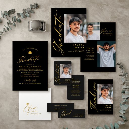 Schwarz-Weiß Abschluss Einladung mit moderner handgeschriebener Kalligraphie und Gradmütze, personalisiertes Foto auf der Rückseite, einfach und einzigartig. Stellen Sie es mit Ihren eigenen Foto- und Abitur-Party-Informationen ein.
