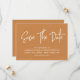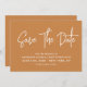 Moderne Kalligraphie Save the Date mit einem erdigen orangefarbenen Hintergrund und einem scannbaren QR-Code für eine Website oder Kontaktinformationen auf der Rückseite.