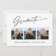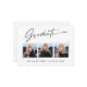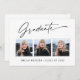 Moderne, moderne und elegante Abschluss 3 Foto-Ansichtskarten mit Designelementen moderner Texte mit kalligraphischem Tintenskript. Die Fotos des Absolventen auf der Vorderseite der Karte sind kunstvoll mit einem delikaten & minimalistischen Gradientenband betont. Die Kartenrückseite bietet personalisierte Textstellen für Informationen über Ihren Abschluss oder können gelöscht werden, wenn Sie eine Nachricht übergeben möchten. Schwarz & Weiß oder einfach den Hintergrund anpassen, um der Grundfarbe Ihrer Schule oder einer beliebigen Farbe Ihrer Wahl zu entsprechen. Ideal für Gymnasiasten, Unis und Studierende.
