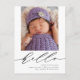 Diese elegante Geburtsankündigung Postkarte zeigt moderne Kalligraphie, die "hallo" und ein großes Foto lautet. Unter der Schrift können Sie den vollständigen Namen, das Geburtsdatum, die Geburtsdaten und Ihre Namen Ihres Babys angeben. Auf der Rückseite der Postkarte können Sie eine benutzerdefinierte Nachricht an die Liebsten schreiben.