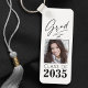 Ein trendiger, neuer zweiseitiger, robuster Aluminium, Graduate Schlüsselanhänger - Keyring mit Foto vorne. Alle Personalisiert, mit "Grad" in elegantem kalligraphischen Tintenskript mit "Klasse von, Das Jahr, Schulname & Ihr Name" in der modernen Typografie. Das Foto des Absolventen wird kunstvoll mit einem zarten Gradientenband betont. Der Text und der Schnitt sind in der Regel schwarz mit dem Hintergrund in Weiß. Wenn Sie möchten, bearbeiten Sie einfach die Hintergrundfarbe in der Grundfarbe Ihrer Schule. Die perfekte Abschluss Geschenkidee für Gymnasiasten, Unis und Studierende.