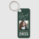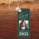 Ein trendiger, neuer zweiseitiger, robuster Aluminium, Graduate Schlüsselanhänger - Keyring mit Foto vorne. Alle Personalisiert, mit "Grad" in elegantem kalligraphischen Tintenskript mit "Klasse von, Das Jahr, Schulname & Ihr Name" in der modernen Typografie. Das Foto des Absolventen wird kunstvoll mit einem zarten Gradientenband betont. Der Text und der Trim sind weiß mit dem Hintergrund in einer modernen Minzgrün Farbe. Wenn Sie möchten, bearbeiten Sie einfach die Hintergrundfarbe in der Grundfarbe Ihrer Schule. Die perfekte Abschluss Geschenkidee für Gymnasiasten, Unis und Studierende.