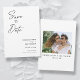 Moderne, minimalistische und elegante "Save the Date" Hochzeitsfotokarten der Verlobung. Dieses individuelle Design mit Elementen des modernen Textes mit einem einzigartigen kalligraphischen Tintenskript. Das Foto für Paare hebt die Rückseite der Karte hervor. Farben sind schwarz geschrieben auf weiß oder einfach anpassen Sie die Basisfarbe, wenn nötig.